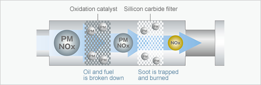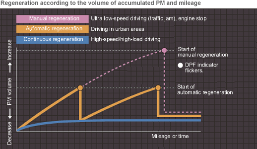 The exhaust gas does not get hot enough for continuous regeneration during driving on urban streets, so the engine raises the temperature of exhaust gas to allow automatic regeneration.