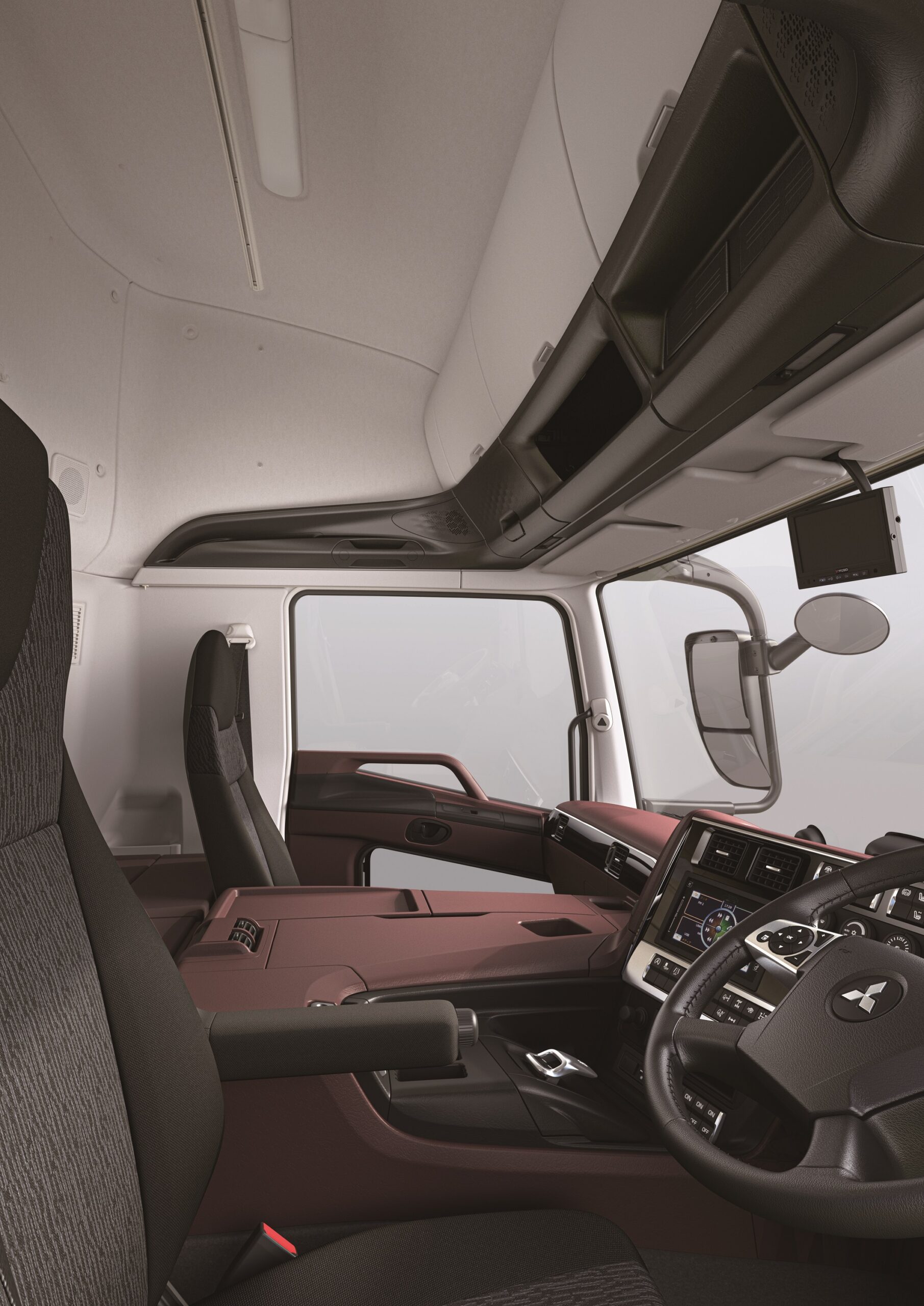 The new super high roof provides a significantly expanded interior space for an improved driving experience. The roomier cab space also contains more storage, for busy drivers requiring smooth access to documents and tools. The super high roof configuration also reduces aerodynamic drag during driving, contributing to better fuel economy. Available color schemes for the interior furnishings have been updated, with black and red designs offered depending on the vehicle grade. The FUSO black belt motif has also been adopted for the interior overhead console.