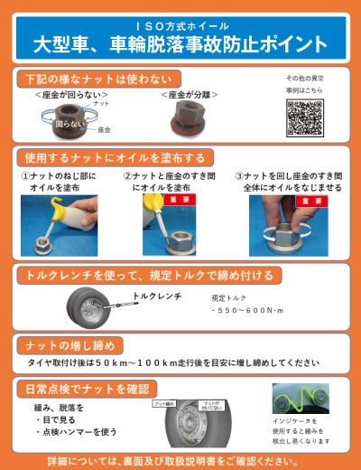 日本自動車工業会においては、大型車メーカー4社から、大型車をご使用いただいている皆様にダイレクトメールをお送りさせていただき、タイヤを脱着した際の適正な点検整備方法をお知らせ致します。