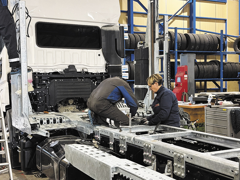 課題解決のために目を向けたのが、世界をリードする欧州の架装技術だった。トランスウェブ社が以前から取り引きのあったイタリアROLFO社に協業を呼びかけ、スーパーグレートのシャシと組み合わせたオリジナル車両をイタリア国内で製造。その過程で得られた知見をもとに、架装部分を再設計・キット化した。