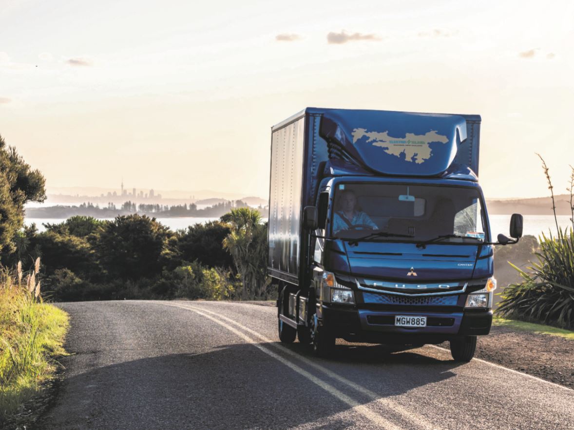 2020年のデモ走行でニュージーランドのワイヘキ島を走る電気小型トラック「eCanter」