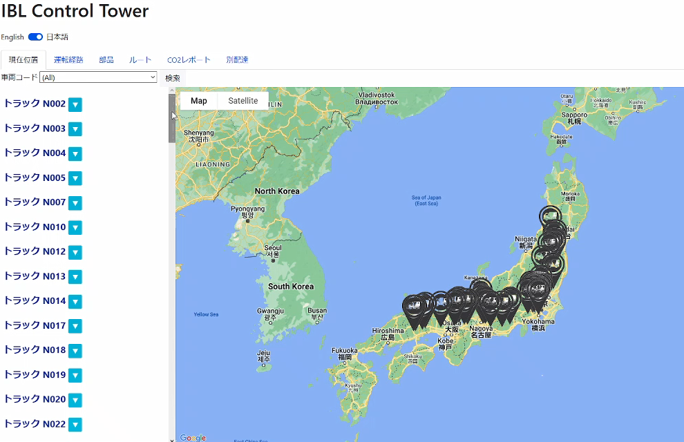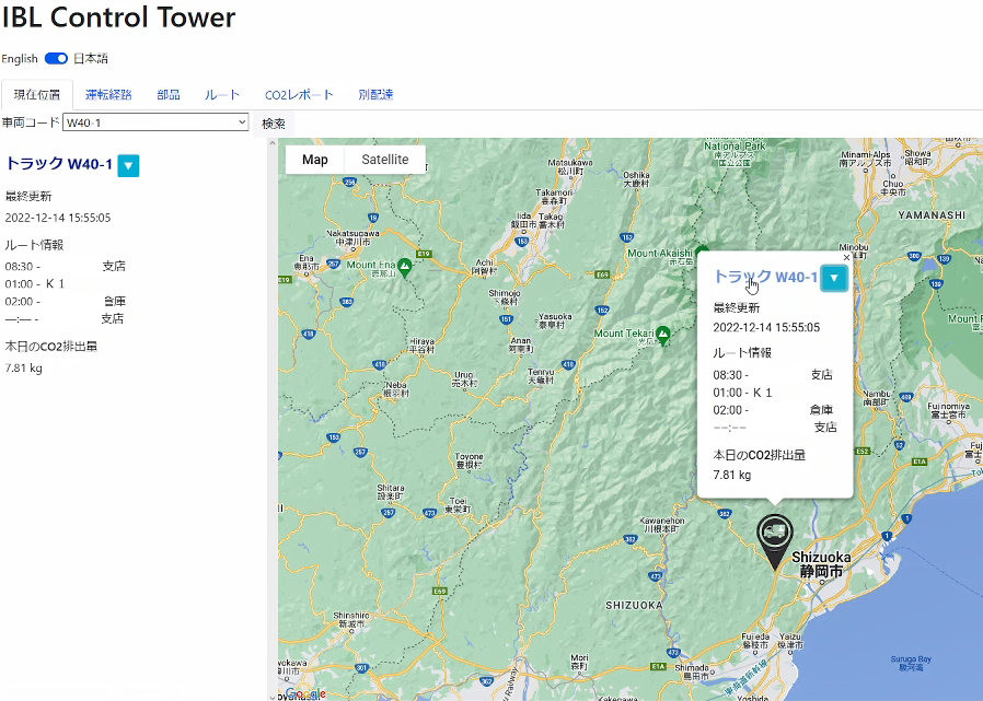 「IBLコントロールタワー」は、MFTBCの製造拠点に入構する部品運搬車両(主にトラック)を対象としています。部品運搬車両にGPS発信機を装着し、車両の位置情報を毎分取得してデータベースに蓄積します。そして、現在・過去の位置情報データや道路交通情報をもとに、人工知能(AI)を用いて部品運搬車両の製造拠点への到着時刻を10分以内の誤差範囲内で予測し、管理担当者に逐次知らせ、遅延発生時の対応を促します。また、位置情報データは車両を運用する物流業者にも共有され、車両運行側のリスク対応にも役立ちます。