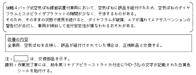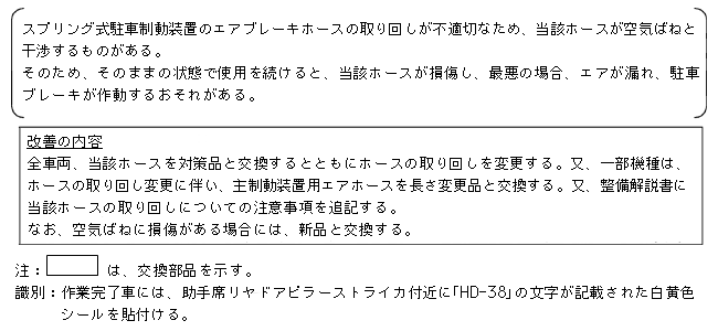| 改善措置の内容 | 全車両、当該ホースを対策品と交換するとともにホースの取り回しを変更する。又、一部機種は、ホースの取り回し変更に伴い、主制動装置用エアホースを長さ変更品と交換する。又、整備解説書に当該ホースの取り回しについての注意事項を追記する。なお、空気ばねに損傷がある場合には、新品と交換する。 全車両、空気ばねを点検し、誤品が組付けされていた場合は、正規新品と交換する。 |