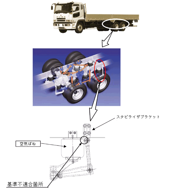 スプリング式駐車制動装置のエアブレーキホースの取り回しが不適切なため、当該ホースが空気ばねと干渉するものがある。そのため、そのままの状態で使用を続けると、当該ホースが損傷し、最悪の場合、エアが漏れ、駐車ブレーキが作動するおそれがある。 後軸4バッグ式空気ばね緩衝装置付車両において、空気ばねに誤品を組付けたため、空気ばねのダイヤフラムとスタビライザブラケットの隙間が少なく、干渉するものがある。そのため、そのままの状態で使用を続けると、ダイヤフラムが破損、エアが漏れてエアサスペンションの警告灯が点灯し、車両が傾斜して走行安定性が損なわれるおそれがある。 |