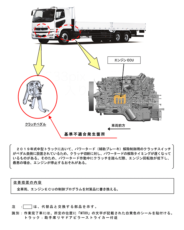 2019年式中型トラックにおいて、パワータード(補助ブレーキ)解除制御用のクラッチスイッチがペダル奥側に設置されているため、クラッチ切断に対し、パワータードの解除タイミングが遅くなっているものがある。そのため、パワータード作動中にクラッチを踏んだ際、エンジン回転数が低下し、最悪の場合、エンジンが停止するおそれがある。 | ||