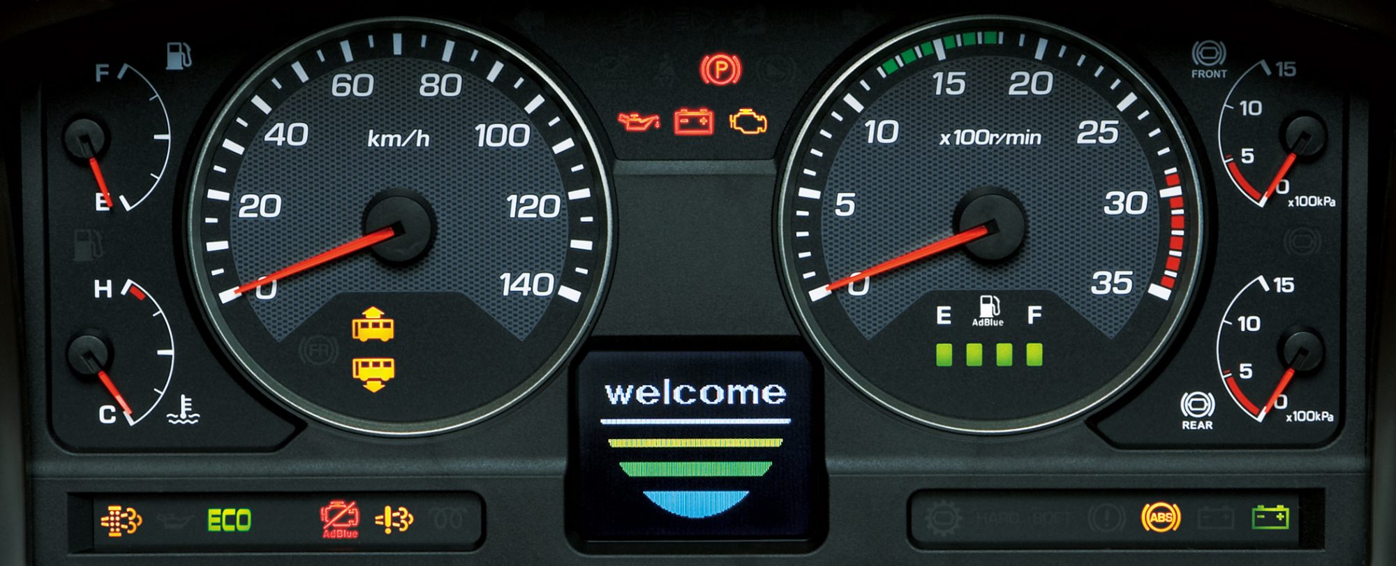 ドライバーは運転席にいながら、走行状況、燃費情報などさまざまな車両情報を、フルカラー多重表示モニターでわかりやすく入手可能。さらに、万一の車両トラブル発生時には、その対処法までも表示。安全性をより高めます。