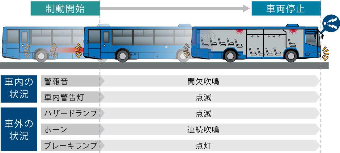 ※運転席非常ボタンが押された場合は即時、制動開始。客席最前部非常ボタンが押された場合は、約3秒後に制動開始。