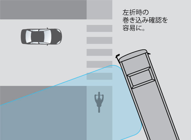 サイドビューカメラ&液晶モニターを標準装備カメラを左側バックミラーステーに装着。バックミラーだけでは確認が困難だったエリアを、インスツルメントパネル左側に設置した液晶モニターに映し出します。直接視界やバックミラーと相まって、左側方の運転視界がさらに拡大。左折時の巻き込み確認や、Y字路での合流確認などさまざまな場面で、安全性を高めます。