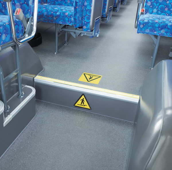 15標準仕様ノンステップバス認定制度に対応したインテリア。座席1列ごと左右両方へのスタンションバー(縦握り棒)の装備*、車いすやベビーカーのためのフリースペースの設置など、15標準仕様ノンステップバス認定制度に対応。より安全で、乗る人にやさしい車内空間を実現しました。