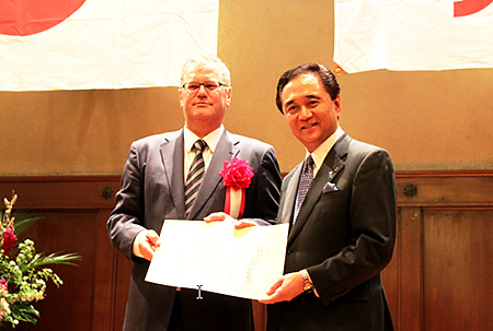 Mr. Yuji Kuroiwa, Governor of Kanagawa Prefecture, right, congratulating Dr. Albert Kirchmann, MFTBC President & CEO and Head of Daimler Trucks Asia, left, at the awarding ceremony held at the Kanagawa Prefectural Government Office, Yokohama, Japan